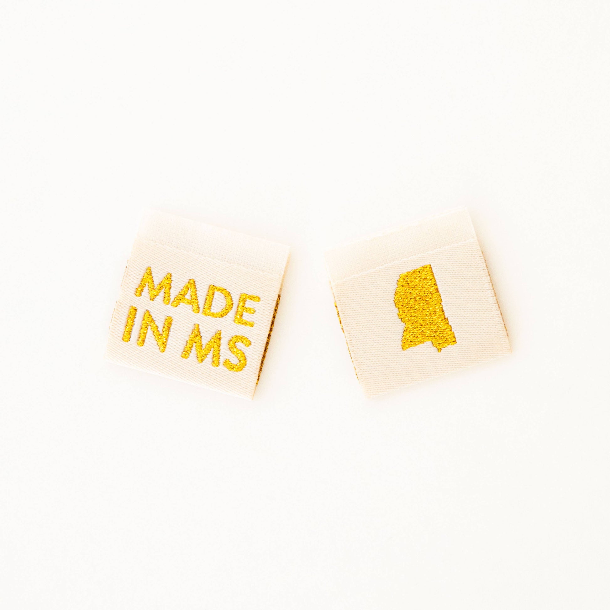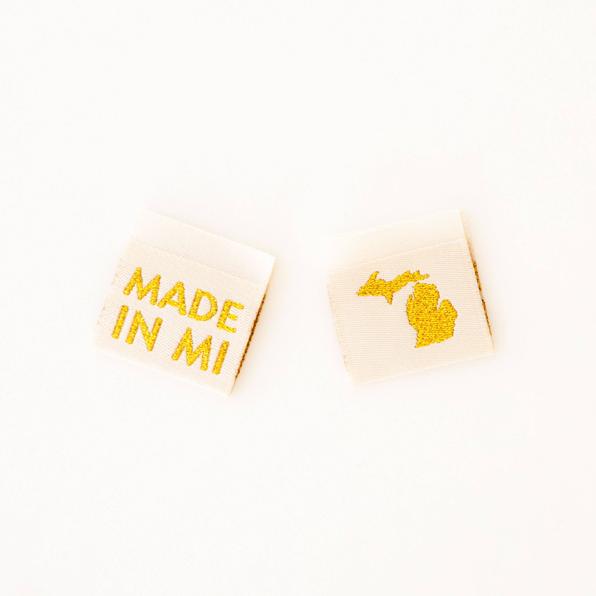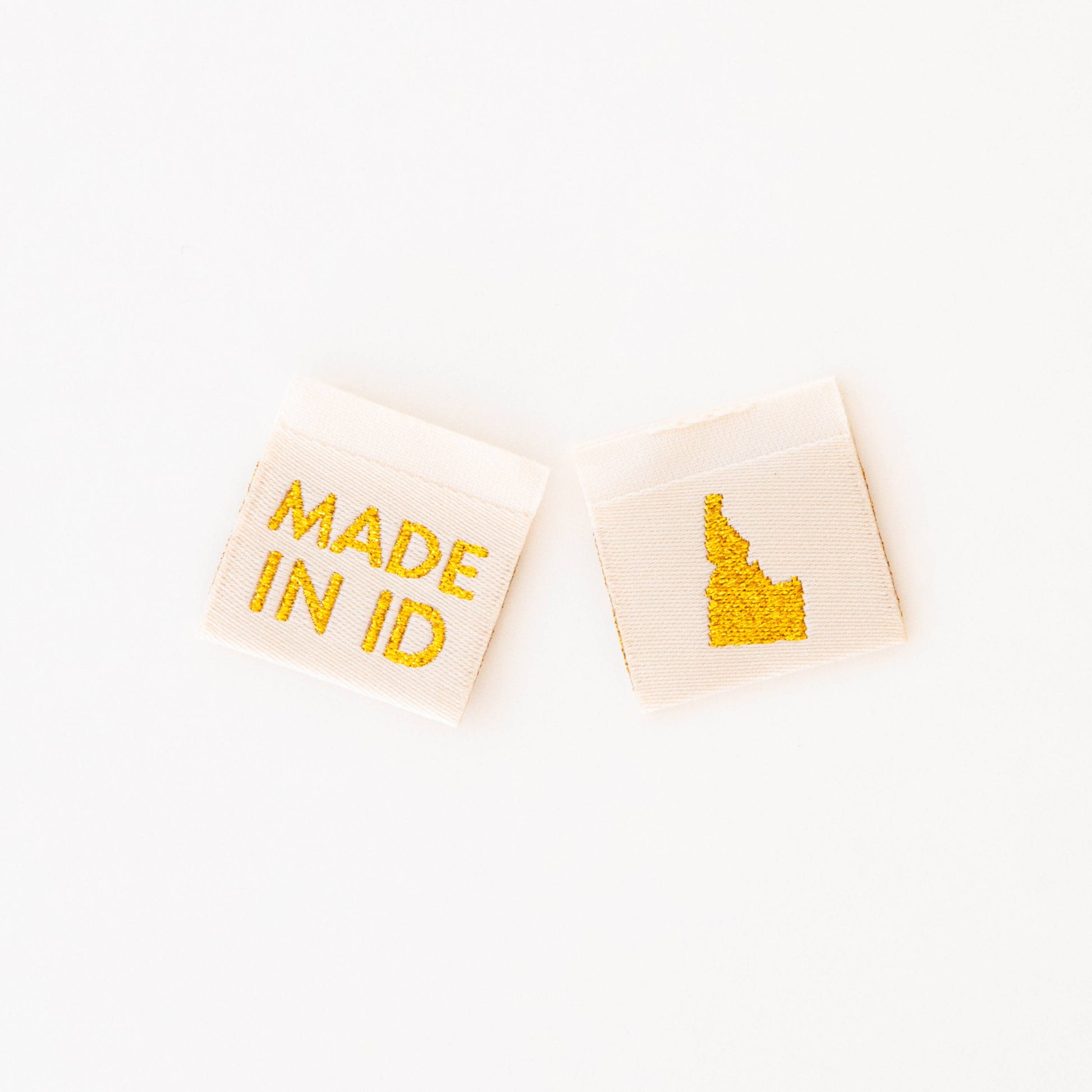 Show off your state pride on all your handmade projects! The labels feature text that says "Made in __" with the abbreviations of each state name on one side and an adorable state silhouette in metallic gold thread on the otheir side. The high-quality woven labels are fully washable and can handle the heat of the dryer.